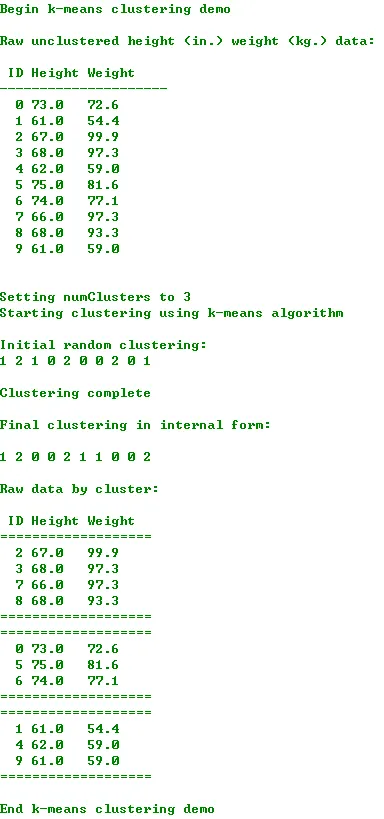 Code below referenced from Machine Learning Using C# Succinctly by James McCaffrey, and article K-Means Data Clustering Using C#.