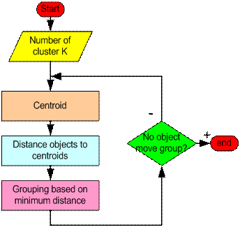 randomly assign all data items to a cluster loop until no change in cluster assignments compute centroids for each cluster reassign each data item to cluster of closest centroid end