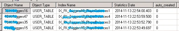 SELECT SCHEMA_NAME(o.[schema_id]) + N'.' + o.[name] AS [Object Name] ,o.type_desc AS [Object Type] ,i.[name] AS [Index Name] ,STATS_DATE(i.[object_id], i.index_id) AS [Statistics Date] ,s.auto_created ,s.no_recompute ,s.user_created ,st.row_count ,st.used_page_count FROM sys.objects AS o WITH (NOLOCK) INNER JOIN sys.indexes AS i WITH (NOLOCK) ON o.[object_id] = i.[object_id] INNER JOIN sys.stats AS s WITH (NOLOCK) ON i.[object_id] = s.[object_id] AND i.index_id = s.stats_id INNER JOIN sys.dm_db_partition_stats AS st WITH (NOLOCK) ON o.[object_id] = st.[object_id] AND i.[index_id] = st.[index_id] WHERE o.[type] IN ( 'U' ,'V' ) AND st.row_count > 0 ORDER BY STATS_DATE(i.[object_id], i.index_id) DESC OPTION (RECOMPILE);