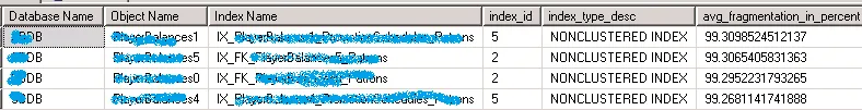 SELECT DB_NAME(ps.database_id) AS [Database Name] ,OBJECT_NAME(ps.[object_id]) AS [Object Name] ,i.[name] AS [Index Name] ,ps.index_id ,ps.index_type_desc ,ps.avg_fragmentation_in_percent ,ps.fragment_count ,ps.page_count ,i.fill_factor ,i.has_filter ,i.filter_definition FROM sys.dm_db_index_physical_stats(DB_ID(), NULL, NULL, NULL, N'LIMITED') AS ps INNER JOIN sys.indexes AS i WITH (NOLOCK) ON ps.[object_id] = i.[object_id] AND ps.index_id = i.index_id WHERE ps.database_id = DB_ID() AND ps.page_count > 2500 ORDER BY ps.avg_fragmentation_in_percent DESC OPTION (RECOMPILE);