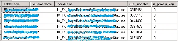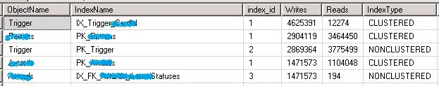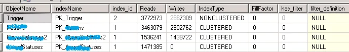 SELECT OBJECT_NAME(s.[object_id]) AS [ObjectName] ,i.[name] AS [IndexName] ,i.index_id ,s.user_updates AS [Writes] ,user_seeks + user_scans + user_lookups AS [Reads] ,i.type_desc AS [IndexType] ,i.fill_factor AS [FillFactor] ,i.has_filter ,i.filter_definition ,s.last_system_update ,s.last_user_update FROM sys.dm_db_index_usage_stats AS s WITH (NOLOCK) INNER JOIN sys.indexes AS i WITH (NOLOCK) ON s.[object_id] = i.[object_id] WHERE OBJECTPROPERTY(s.[object_id], 'IsUserTable') = 1 AND i.index_id = s.index_id AND s.database_id = DB_ID() ORDER BY s.user_updates DESC OPTION (RECOMPILE);