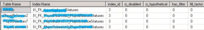 SELECT OBJECT_NAME(s.[object_id]) AS [Table Name] ,i.[name] AS [Index Name] ,i.index_id ,i.is_disabled ,i.is_hypothetical ,i.has_filter ,i.fill_factor ,user_updates AS [Total Writes] ,user_seeks + user_scans + user_lookups AS [Total Reads] ,user_updates - (user_seeks + user_scans + user_lookups) AS [Difference] FROM sys.dm_db_index_usage_stats AS s WITH (NOLOCK) INNER JOIN sys.indexes AS i WITH (NOLOCK) ON s.[object_id] = i.[object_id] AND i.index_id = s.index_id WHERE OBJECTPROPERTY(s.[object_id], 'IsUserTable') = 1 AND s.database_id = DB_ID() AND user_updates > (user_seeks + user_scans + user_lookups) AND i.index_id > 1 ORDER BY [Difference] DESC ,[Total Writes] DESC ,[Total Reads] ASC OPTION (RECOMPILE);