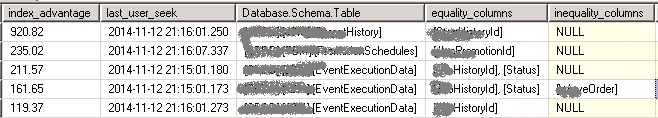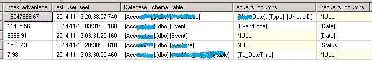 SELECT CONVERT(DECIMAL(18, 2), user_seeks * avg_total_user_cost * (avg_user_impact * 0.01)) AS [index_advantage] ,migs.last_user_seek ,mid.[statement] AS [Database.Schema.Table] ,mid.equality_columns ,mid.inequality_columns ,mid.included_columns ,migs.unique_compiles ,migs.user_seeks ,migs.avg_total_user_cost ,migs.avg_user_impact FROM sys.dm_db_missing_index_group_stats AS migs WITH (NOLOCK) INNER JOIN sys.dm_db_missing_index_groups AS mig WITH (NOLOCK) ON migs.group_handle = mig.index_group_handle INNER JOIN sys.dm_db_missing_index_details AS mid WITH (NOLOCK) ON mig.index_handle = mid.index_handle ORDER BY index_advantage DESC OPTION (RECOMPILE);