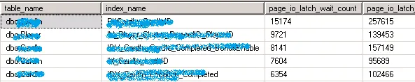 SELECT OBJECT_SCHEMA_NAME(ios.object_id) + '.' + OBJECT_NAME(ios.object_id) AS table_name ,i.[name] AS index_name ,page_io_latch_wait_count ,page_io_latch_wait_in_ms ,CAST(1. * page_io_latch_wait_in_ms / NULLIF(page_io_latch_wait_count, 0) AS DECIMAL(12, 2)) AS page_io_avg_lock_wait_ms ,page_latch_wait_count ,page_latch_wait_in_ms ,CAST(1. * page_latch_wait_in_ms / NULLIF(page_latch_wait_count, 0) AS DECIMAL(12, 2)) AS page_avg_lock_wait_ms FROM sys.dm_db_index_operational_stats(DB_ID(), NULL, NULL, NULL) ios INNER JOIN sys.indexes i ON i.object_id = ios.object_id AND i.index_id = ios.index_id WHERE OBJECTPROPERTY(ios.object_id, 'IsUserTable') = 1 ORDER BY 3 DESC