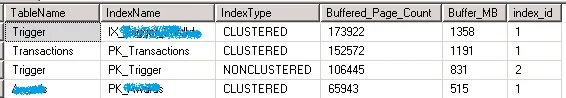 SELECT TOP 25 obj.[name] AS TableName ,i.[name] AS IndexName ,i.[type_desc] AS IndexType ,count(*) AS Buffered_Page_Count ,count(*) * 8192 / (1024 * 1024) AS Buffer_MB ,obj.index_id FROM sys.dm_os_buffer_descriptors AS bd INNER JOIN ( SELECT object_name(object_id) AS NAME ,index_id ,allocation_unit_id ,object_id FROM sys.allocation_units AS au INNER JOIN sys.partitions AS p ON au.container_id = p.hobt_id AND ( au.type = 1 OR au.type = 3 ) UNION ALL SELECT object_name(object_id) AS NAME ,index_id ,allocation_unit_id ,object_id FROM sys.allocation_units AS au INNER JOIN sys.partitions AS p ON au.container_id = p.hobt_id AND au.type = 2 ) AS obj ON bd.allocation_unit_id = obj.allocation_unit_id LEFT JOIN sys.indexes i ON i.object_id = obj.object_id AND i.index_id = obj.index_id WHERE database_id = db_id() GROUP BY obj.NAME ,obj.index_id ,i.[name] ,i.[type_desc] ORDER BY Buffered_Page_Count DESC