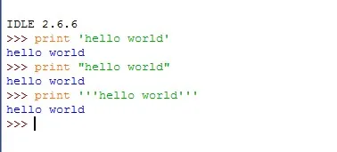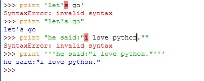 从上面可以看出三种声明方法的效果是完全一样的,在Python中用这三种声明方法来声明字符串意义完全等同的,即'hello world'和"hello world"以及'''hello world'''是没有任何区别的。但是会有人问:既然是完全等同的,为什么要弄出三种声明方式呢?下面看一下这几个例子: