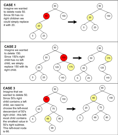 - 情况 1:如果删除的节点没有右孩子,那么就选择它的左孩子来代替原来的节点。二叉查找树的性质保证了被删除节点的左子树必然符合二叉查找树的性质。因此左子树的值要么都大于,要么都小于被删除节点的父节点的值,这取决于被删除节点是左孩子还是右孩子。因此用被删除节点的左子树来替代被删除节点,是完全符合二叉搜索树的性质的。