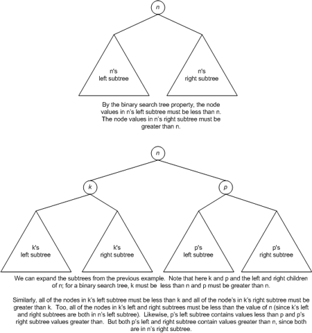 - 其右子树(right subtree)下的每个后代节点的值都大于节点 n 的值。