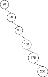 而实际上,对于 BST 查找算法来说,其十分依赖于树中节点的拓扑结构,也就是节点间的布局关系。下图描绘了一个节点插入顺序为 20, 50, 90, 150, 175, 200 的 BST 树。这些节点是按照递升顺序被插入的,结果就是这棵树没有广度(Breadth)可言。也就是说,它的拓扑结构其实就是将节点排布在一条线上,而不是以扇形结构散开,所以查找时间也为 O(n)。