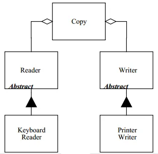 设想如图 2 中的类图结构。类 "Copy" 包含了一个抽象类 "Reader" 和另一个抽象类 "Writer"。可以想象在 "Copy" 中的循环结构不断的从 "Reader" 读取字符,然后将字符发送至 "Writer"。