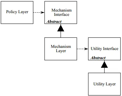 每一个低层都被一个抽象类所表述,而实际的层级则由这些抽象类所派生。每一个高层类通过抽象接口来使用低层类。因此,层级之间不会依赖其他的层。取而代之的是,层依赖了抽象类。这不仅打破了 Policy Layer 到 Utility Layer 的传递性依赖,同时也将 Policy Layer 到 Mechanism Layer 的依赖打破。