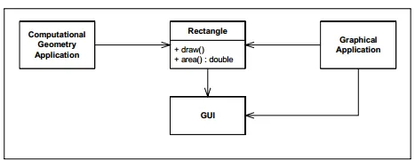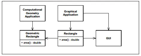 有两个不同的应用程序均使用了 Rectangle 类。一个应用为计算几何程序,它使用了 Rectangle 中的数学几何模型,但不会在显示屏幕上绘制矩形。另一个应用是一个图形界面程序(GUI),它可能会做一些计算几何方面的工作,但主要功能是在屏幕上绘制矩形。