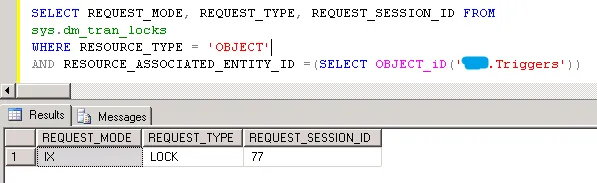 SELECT REQUEST_MODE, REQUEST_TYPE, REQUEST_SESSION_ID FROM sys.dm_tran_locks WHERE RESOURCE_TYPE = 'OBJECT' AND RESOURCE_ASSOCIATED_ENTITY_ID =(SELECT OBJECT_iD('Triggers'))