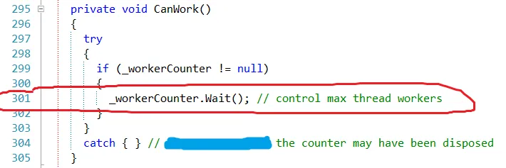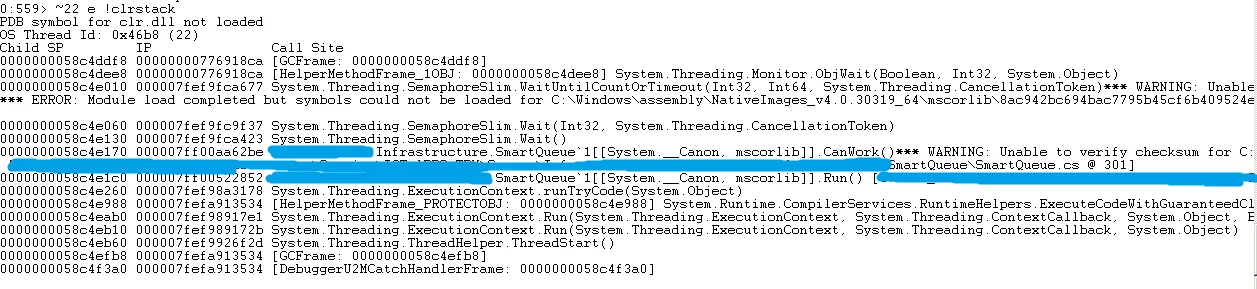 这个很有帮助,发现第22个线程在 SemaphoreSlim.Wait() 等待一个信号量释放,而其为类 SmartQueue 中的代码。还好加了PDB文件,直接显示到 SmartQueue.cs 的第 301 行。直接看看代码,
