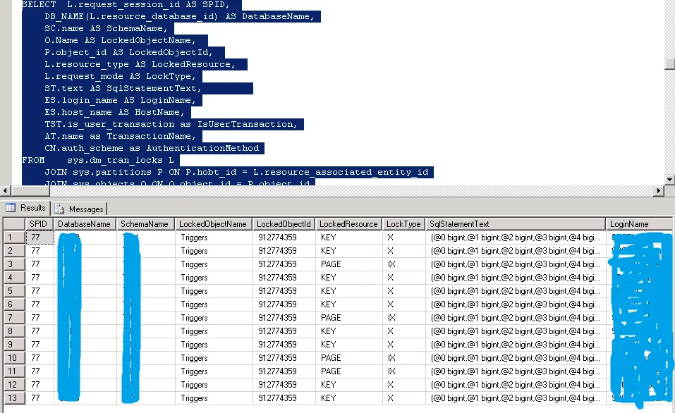 SELECT L.request_session_id AS SPID, DB_NAME(L.resource_database_id) AS DatabaseName, SC.name AS SchemaName, O.Name AS LockedObjectName, P.object_id AS LockedObjectId, L.resource_type AS LockedResource, L.request_mode AS LockType, ST.text AS SqlStatementText, ES.login_name AS LoginName, ES.host_name AS HostName, TST.is_user_transaction as IsUserTransaction, AT.name as TransactionName, CN.auth_scheme as AuthenticationMethod FROM sys.dm_tran_locks L JOIN sys.partitions P ON P.hobt_id = L.resource_associated_entity_id JOIN sys.objects O ON O.object_id = P.object_id JOIN sys.schemas SC ON O.schema_id = SC.schema_id JOIN sys.dm_exec_sessions ES ON ES.session_id = L.request_session_id JOIN sys.dm_tran_session_transactions TST ON ES.session_id = TST.session_id JOIN sys.dm_tran_active_transactions AT ON TST.transaction_id = AT.transaction_id JOIN sys.dm_exec_connections CN ON CN.session_id = ES.session_id CROSS APPLY sys.dm_exec_sql_text(CN.most_recent_sql_handle) AS ST WHERE resource_database_id = db_id() ORDER BY SchemaName