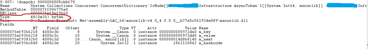 可以明确判断,每个AsyncToken实例只占48Bytes。而其为ConcurrentDictionary中的一个Node,代表一个KeyValue键值对。