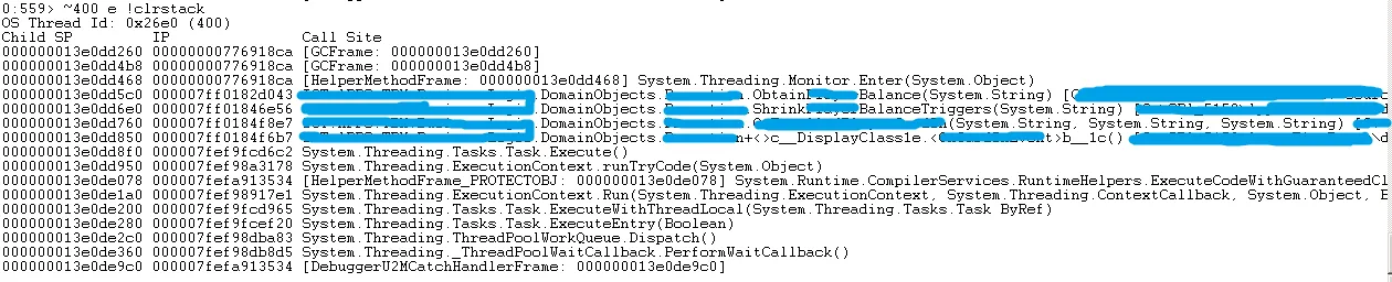 希望来了,这个调用占说明,在方法ObtainXXX中,正在Monitor.Enter(object),也就是一个lock在尝试锁定对象。此时继续查看线程调用栈,40/50/100/200/300/400/500线程均Block在ObtainXXX方法中。