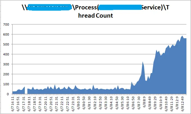 但奇怪的是,线程数在 6 月 8 日 7:30 左右才开始爆发。