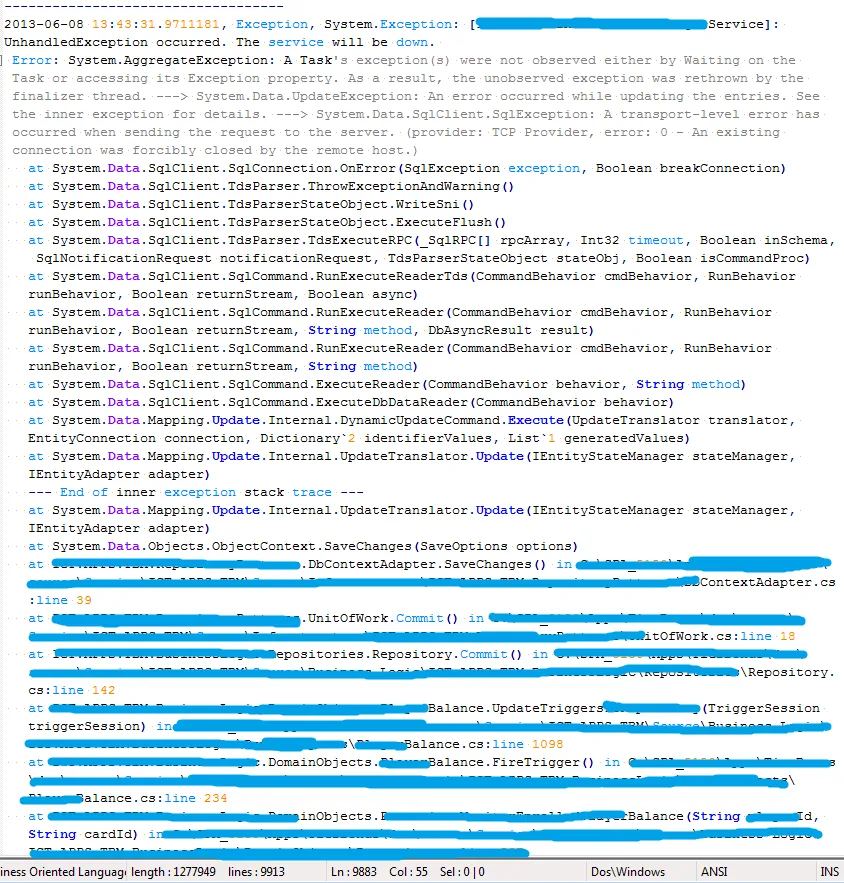 是的,在进程死之前,居然打了句Log,真给力啊。至少它明确的告诉了我,“An existing connection was forcibly closed by the remote host.”。这就是我的Kill操作。