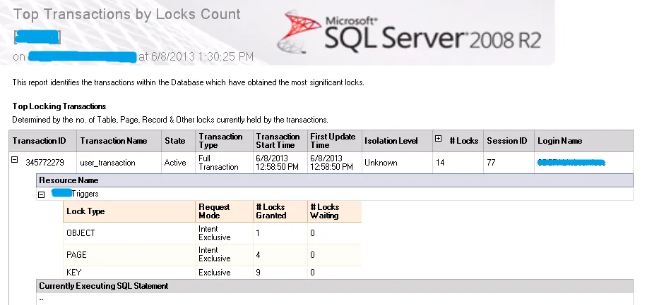 SQL Server Management Studio 提供了些默认的报表,先看看。发现一张有用的报表 Top Transactions by Locks Count,