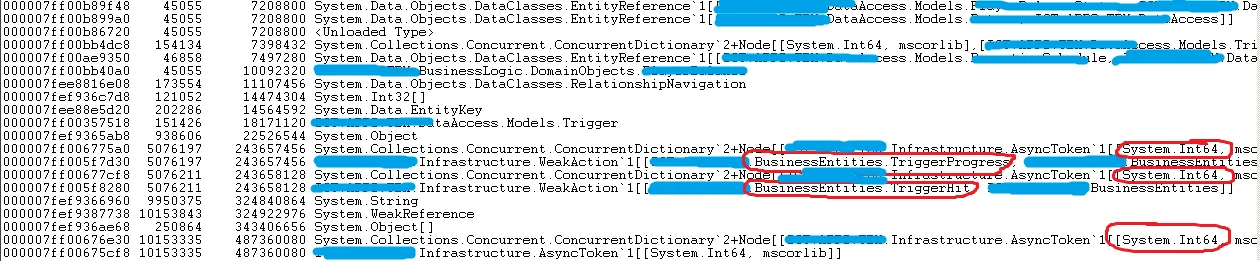 综合以上可以看出,几种类型 TriggerProgress、TriggerHit、long、AsyncToken 类型最多。从业务设计上看 TriggerProgress/TriggerHit 业务类实例的个数是相同的,从图上看也是相同的,但数量肯定不至于有507万个。每个类型的占用内存大概在240M以上。而有差不多数量的 AsyncToken 类型,占用也在240M左右。而 long 类型,存放在 ConcurrentDictionary 中,应该是作为某种索引,居然有1000万条,空间占用480M以上。这几个类型的占用总和已经达到了3G左右。所以说,这里应该是内存泄漏的根源。