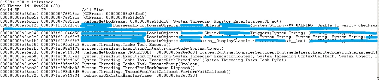 而这个操作是在Update这个Triggers表,也就是Transaction在这里产生了DeadLock最终没有返回,导致此处代码一直被Block,进而没有释放lock(object),进而阻塞线程,并阻止了其他线程的访问。