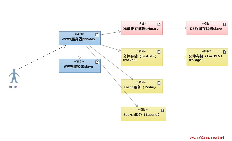 在你的项目中,可以会有WWW网站,file文件存储,db数据库,cache缓存数据,search大数据检索分配不同的服务器,这是大事所趋的,而fastDFS被指派到了file文件存储之中,看一下标准的系统物理架构的图示:
