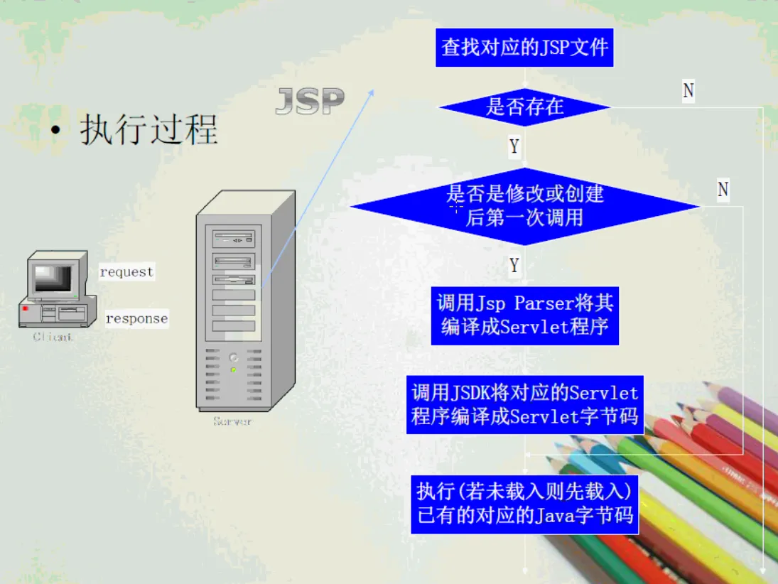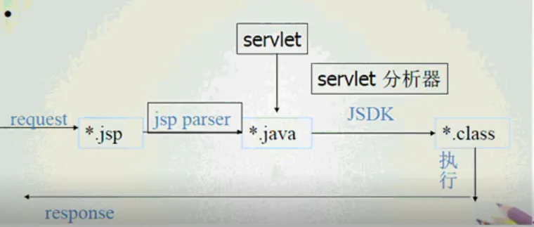 2. 服务器(Tomcat)提供的jsp parser 解析器解将jsp转化为java文件。 jsp本质上是一个servlet。