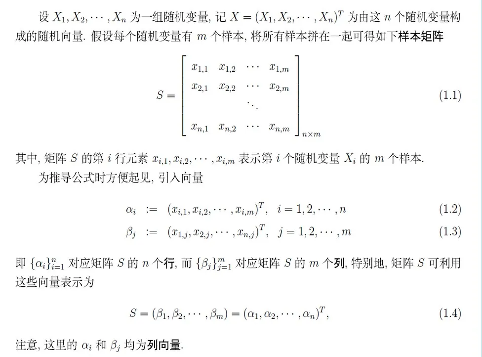 如果是一个随机变量,那么它的样本值可以用一个向量表示。相对的,如果针对一个随机向量,那么就需要利用矩阵表示,因为向量中的每一个变量的采样值,都可以利用一个向量表示。
