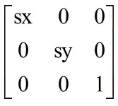 缩放变换,将每一点的横坐标放大(缩小)至sx倍,纵坐标放大(缩小)至sy倍,变换矩阵为:
