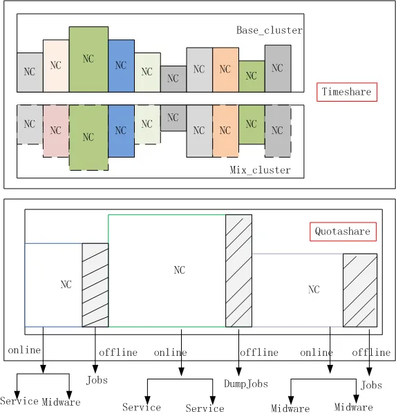 离线任务(Jobs或者短周期任务)、在线任务(service或者长周期任务)通过合并部署来共享宿主机资源。一种是实时错峰共享资源,当调度系统发现当前在线任务的资源利用率比较低的时候,把离线任务调度上来运行,从而提高资源的利用率。但要确保在线任务优先抢占资源,如果发生离线任务和在线任务争抢资源的情况,要杀掉离线任务,把资源让给在线任务。一种是固定配额来共享,service和jobs固定一定的资源,然后根据service空闲周期,jobs加大资源计算,动态调整CPU资源,假设内存、IO都不是瓶颈,也就是部分的调整资源给jobs。或者不关注service空闲,在jobs固定配额内自由提交jobs计算。这种时间窗口越短,对任务切换要求能力更高,需要资源实时预测模型。例如 Borg系统,针对进程最近时刻内存开销进行实时调整。这对C、C++是有益处的,而对java就很难快速实施了,因为需要改JVM参数,从而JVM需要重启,然后是业务代码重启。一种是分时独占交付,在service空闲周期内,service停止服务,完整的将资源空闲出来给jobs使用。