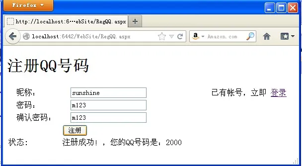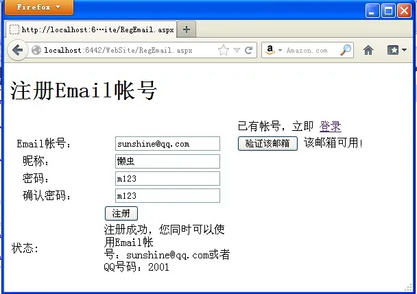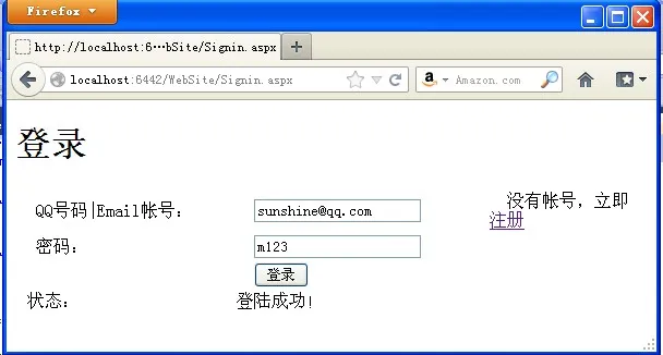 using System; public partial class Signin : System.Web.UI.Page { protected void Page_Load(object sender, EventArgs e) { } protected void Button1_Click(object sender, EventArgs e) { //登录 int userID; if (int.TryParse(txtID.Text, out userID)) { //QQ号码登录 if (UsersOper.ExistsUserQQ(userID, txtUserpass.Text)) { lblState.Text = "登陆成功!"; } else { lblState.Text = "用户名或密码有误!"; } } else { //Email帐号登录 if (UsersOper.ExistsUserEmail(txtID.Text, txtUserpass.Text)) { lblState.Text = "登陆成功!"; } else { lblState.Text = "用户名或密码有误!"; } } } }