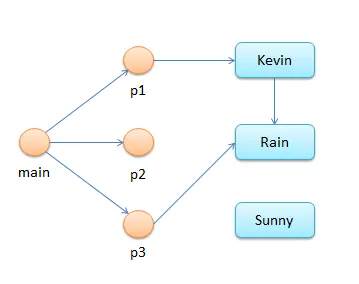 1 package test; 2 3 4 public class Test{ 5 6 public static void main(String[] args) { 7 Person p1 = new Person("Kevin"); 8 Person p2 = new Person("Rain"); 9 Person p3 = new Person("Sunny"); 10 11 p1.friend = p2; 12 p3 = p2; 13 p2 = null; 14 } 15 }