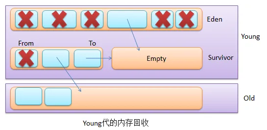 Ⅱ组成区域 :由1个Eden区和2个Survivor区构成,同一时间的两个Survivor区,一个用来保存对象,另一个是空的;每次进行Young代垃圾回收的 时候,就把Eden,From中的可达对象复制到To区域中,一些生存时间长的就复制到了老年代,接着清除Eden,From空间,最后原来的To空间变 为From空间,原来的From空间变为To空间。