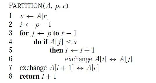 Partition(A,p,r)的目的是将从数组A[p....r]中选一个数q,将小于q的元素放在q左边,大于q的放在右边。可以先自己思考 一下这个算法能怎样实现。