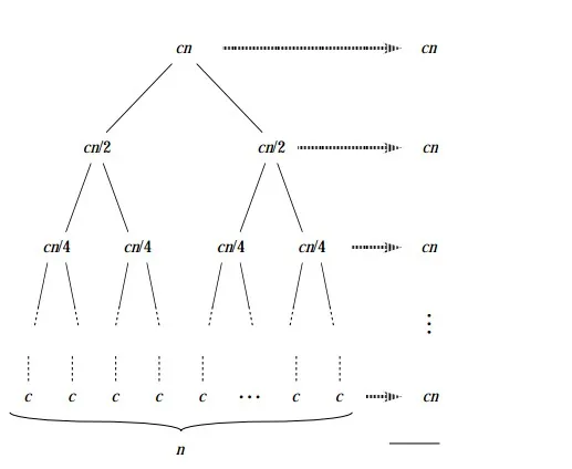 请注意这个树的每一层代价都是cn ,直到图中的倒数第三行未知,在此之前各层的代价至多为cn,后面的代价总是小于cn,
