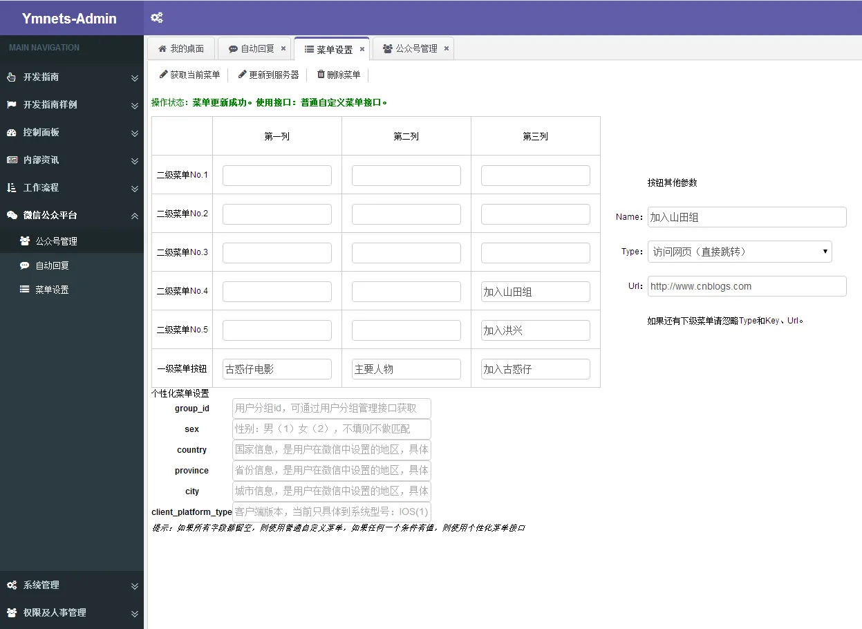[HttpPost] public ActionResult CreateMenu( GetMenuResultFull resultFull, MenuMatchRule menuMatchRule) { WC_OfficalAccountsModel model = account_BLL.GetCurrentAccount(); string token = model.AccessToken; var useAddCondidionalApi = menuMatchRule != null && !menuMatchRule.CheckAllNull(); var apiName = string.Format("使用接口:{0}。", (useAddCondidionalApi ? "个性化菜单接口" : "普通自定义菜单接口")); try { //重新整理按钮信息 WxJsonResult result = null; IButtonGroupBase buttonGroup = null; if (useAddCondidionalApi) { //个性化接口 buttonGroup = Senparc.Weixin.MP.CommonAPIs.CommonApi.GetMenuFromJsonResult(resultFull, new ConditionalButtonGroup()).menu; var addConditionalButtonGroup = buttonGroup as ConditionalButtonGroup; addConditionalButtonGroup.matchrule = menuMatchRule; result = Senparc.Weixin.MP.CommonAPIs.CommonApi.CreateMenuConditional(token, addConditionalButtonGroup); apiName += string.Format("menuid:{0}。", (result as CreateMenuConditionalResult).menuid); } else { //普通接口 buttonGroup = Senparc.Weixin.MP.CommonAPIs.CommonApi.GetMenuFromJsonResult(resultFull, new ButtonGroup()).menu; result = Senparc.Weixin.MP.CommonAPIs.CommonApi.CreateMenu(token, buttonGroup); } var json = new { Success = result.errmsg == "ok", Message = "菜单更新成功。" + apiName }; return Json(json); } catch (Exception ex) { var json = new { Success = false, Message = string.Format("更新失败:{0}。{1}", ex.Message, apiName) }; return Json(json); } } public ActionResult GetMenu() { WC_OfficalAccountsModel model = account_BLL.GetCurrentAccount(); string token = model.AccessToken; var result = Senparc.Weixin.MP.CommonAPIs.CommonApi.GetMenu(token); if (result == null) { return Json(new { error = "菜单不存在或验证失败!" }, JsonRequestBehavior.AllowGet); } return Json(result, JsonRequestBehavior.AllowGet); } public ActionResult DeleteMenu() { try { WC_OfficalAccountsModel model = account_BLL.GetCurrentAccount(); string token = model.AccessToken; var result = Senparc.Weixin.MP.CommonAPIs.CommonApi.DeleteMenu(token); var json = new { Success = result.errmsg == "ok", Message = result.errmsg }; return Json(json, JsonRequestBehavior.AllowGet); } catch (Exception ex) { var json = new { Success = false, Message = ex.Message }; return Json(json, JsonRequestBehavior.AllowGet); } }