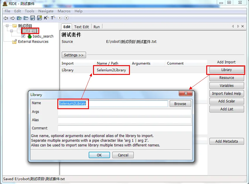 在“测试套件”的Edit标签页,点击“Library”按钮,弹出输入框,Name输入:Selenium2Library,点击OK 完。