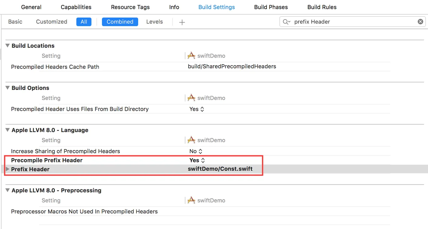 注意:创建的宏文件,也即Const.swift文件的路径设置和OC是一样的,都需要在buildSetting中prefix Header处设置。