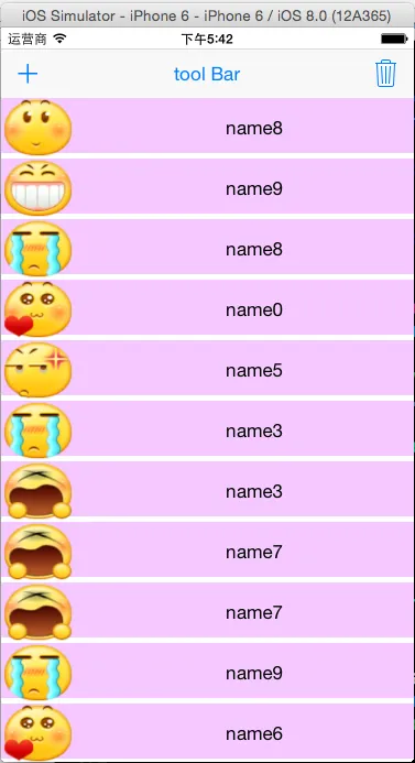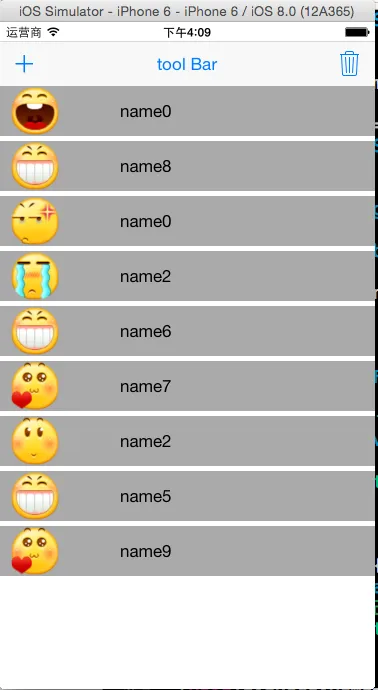 1 #import "ViewController.h" 2 #define CONTACE_VIEW_HEIGHT 50 3 @interface ViewController () 4 @property (weak, nonatomic) IBOutlet UIToolbar *toolBar; 5 @property (weak, nonatomic) IBOutlet UIBarButtonItem *barButtonitemDelete; 6 7 @end 8 9 @implementation ViewController 10 - (IBAction)addContact:(UIBarButtonItem *)sender 11 { 12 13 //让删除按钮有效 14 [self.barButtonitemDelete setEnabled:YES]; 15 16 //在subView中已经有了3个控件 17 NSInteger count = self.view.subviews.count - 3; 18 CGRect lastFrame = self.toolBar.frame; 19 20 UIView *contactView = [[UIView alloc]init]; 21 CGFloat gapY = 5; 22 CGFloat x = 0; 23 CGFloat y = lastFrame.origin.y + lastFrame.size.height + (CONTACE_VIEW_HEIGHT+gapY) * count; 24 CGFloat w = self.view.frame.size.width; 25 26 contactView.frame = CGRectMake(x,y,w,CONTACE_VIEW_HEIGHT); 27 28 29 //添加头像 30 UIImage *image = [UIImage imageNamed:[NSString stringWithFormat:@"%d.png",arc4random_uniform(9)]]; 31 UIImageView *face = [[UIImageView alloc]initWithImage:image]; 32 face.frame = CGRectMake(10, 0,50,50); 33 [contactView addSubview:face]; 34 35 //添加姓名 36 UILabel *labelName = [[UILabel alloc]init]; 37 labelName.text = [NSString stringWithFormat:@"name%d",arc4random_uniform(10)]; 38 labelName.frame = CGRectMake(10+image.size.width+50, 0, 100, 50); 39 [contactView addSubview:labelName]; 40 41 42 contactView.backgroundColor = [UIColor lightGrayColor]; 43 44 [self.view addSubview:contactView]; 45 } 46 - (IBAction)deleteContact:(UIBarButtonItem *)sender 47 { 48 //删除视图 49 UIView *lastView = [self.view.subviews lastObject]; 50 [lastView removeFromSuperview]; 51 52 //如果没有了contactView,设置删除按钮无效 53 if(self.view.subviews.count == 3) 54 { 55 [self.barButtonitemDelete setEnabled:NO]; 56 } 57 } 58 59 - (void)viewDidLoad { 60 [super viewDidLoad]; 61 //开始时删除设置为无效 62 [self.barButtonitemDelete setEnabled:NO]; 63 } 64 65 - (void)didReceiveMemoryWarning { 66 [super didReceiveMemoryWarning]; 67 // Dispose of any resources that can be recreated. 68 }