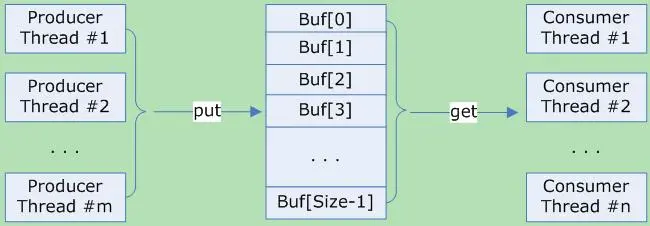 在缓冲区中有可用空间时,一个或一组生产者(线程或进程)将创建的产品(数据条目)放入缓冲区,然后由一个或一组消费者(线程或进程)提取这些产品。产品在生产者和消费者之间通过某种类型的IPC传递。
