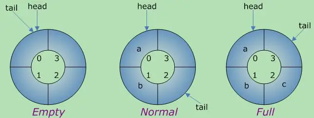其中,为区分队空与队满,在入队时少用一个数据(图中下标为3的位置)。本文约定队首指针head指向队首元素,队尾指针tail指向队尾元素的下一个元素,以队尾指针加1等于队首指针判断队满,即: