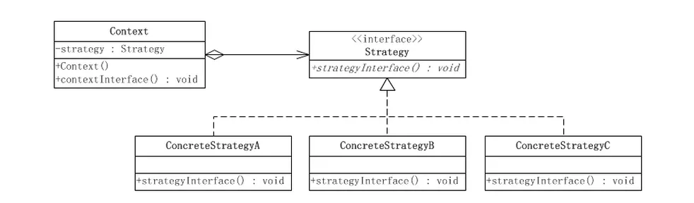 抽象策略(Strategy)角色:这是一个抽象角色,通常由一个接口或抽象类实现。此角色给出所有的具体策略类所需的接口;