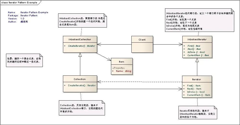 迭代器模式(Iterator Pattern),提供一种方法顺序访问一个聚合对象中元素,而不暴露改集合对象的内部表示。迭代器模式就是分离了集合对想的遍历行为,抽象出一个迭代器类来负责,这样即可以不暴露集合的内部机构,又可让外部代码透明地访问集合内部的数据