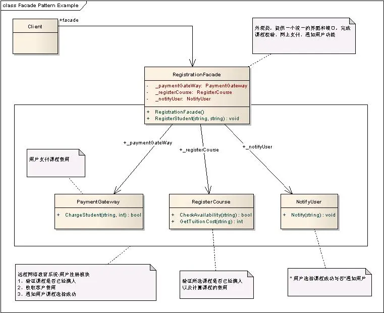 RegistrationFacade类:外观类,提供一个统一的界面和接口,完成课程校验、网上支付、通知用户功能