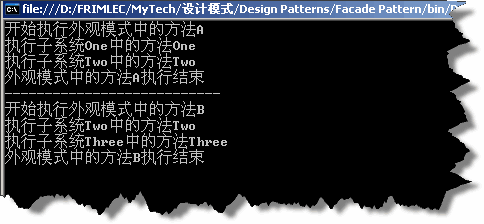 public void MethodA() { Console.WriteLine("开始执行外观模式中的方法A"); one.MethodOne(); two.MethodTwo(); Console.WriteLine("外观模式中的方法A执行结束"); Console.WriteLine("---------------------------"); }