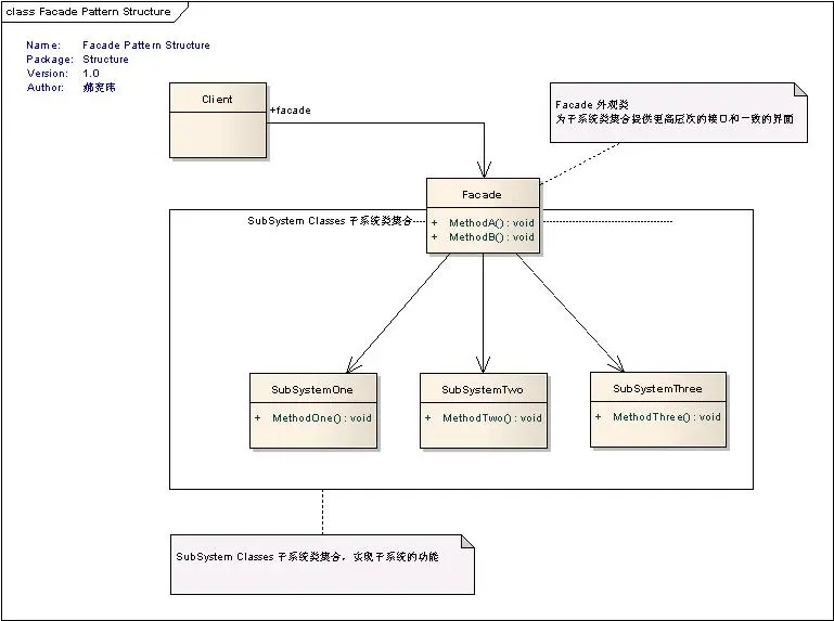 public Facade() { one = new SubSystemOne(); two = new SubSystemTwo(); three = new SubSystemThree(); }