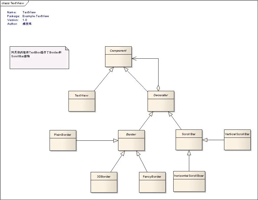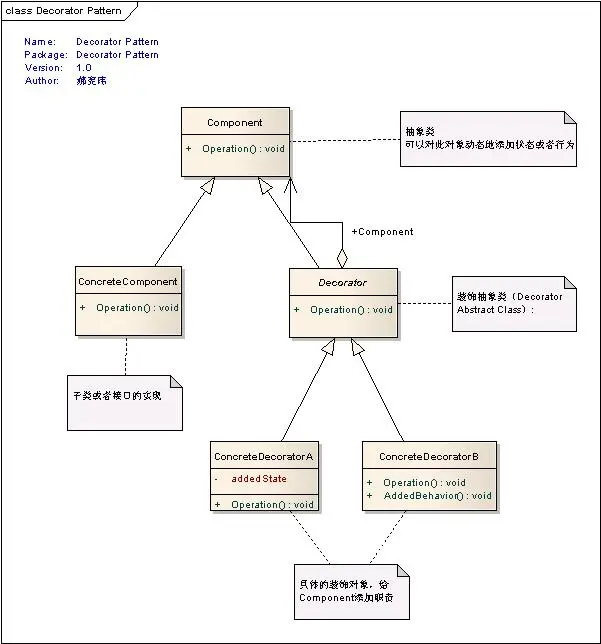 Decorator抽象装饰类,继承了Component对象接口,从外类扩展Component类的功能,但对于Component来说,是无需知道Decorator的存在。
