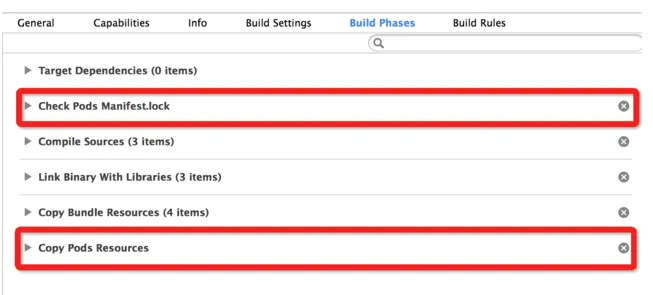 4.打开Build Phases选项,删除Check Pods Manifest.lock和Copy Pods Resources: