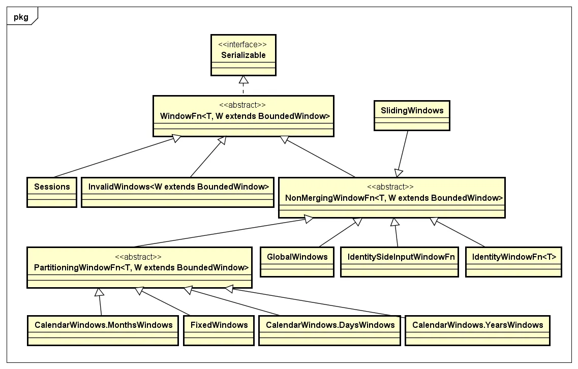 Window是用来处理某一个Micro batch的数据记录可以进行Merge这种场景的需求,通常用在Streaming处理的情况下。Apache Beam也提供了对Window的抽象,其中对于某一个Window下的数据的处理,是通过WindowFn接口来定义的,与该接口相关的处理类,如下类图所示: